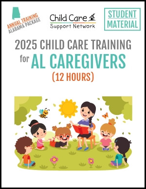 This printed package fulfills 12 clock hours of annual training required for Caregivers and Teachers per the Alabama Department of Human Resources / Child Care Services Division, Office of Child Care Licensing. The material includes 6 Trainings which cover 6 topics taking the guesswork out of it for you!
