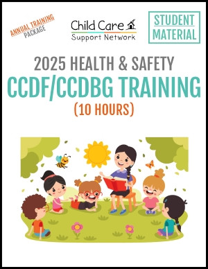 This printed package fulfills 10 clock hours of Health & Safety CCDF/CCDBG annual training requirements for Caregivers, Staff, and Directors in select states. We chose material that covers 10 of the 11 required Health & Safety topics per the U.S. Department of Health & Human Services / Administration for Children and Families, Office of Child Care taking the guesswork out of it for you! First aid and CPR are not covered in this package.