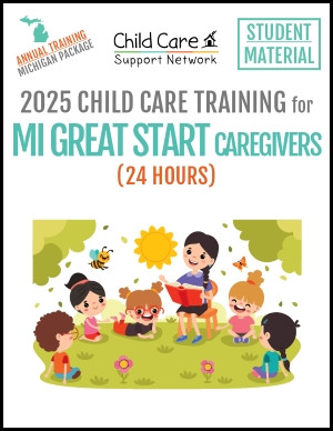 These printed packages are available as a 16 clock hour package for Standard Centers or as a 24 clock hour package for Great Start Centers. The material we selected covers topics per the Michigan Department of Licensing and Regulatory Affairs / Child Care Licensing Bureau which takes the guesswork out and we enter completed Packages in MiRegistry for you!